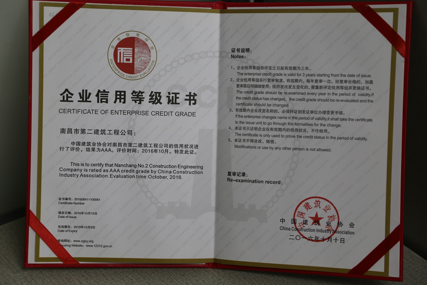 企業(yè)信用等級是由中國建筑業(yè)協(xié)會經(jīng)審核、篩選和評定而確定的,有效期3年,每年復(fù)審一次。由于公司一直本著誠信、服務(wù)、質(zhì)量為上的原則,獲得了中國建筑業(yè)協(xié)會及社會大眾的認(rèn)可,2016年10月公司再度榮獲“AAA級信用企業(yè)”的榮譽稱號。這個全國建筑行業(yè)都為數(shù)不多的榮譽是對我們企業(yè)的肯定及嘉獎,讓我們樹起信譽旗幟,再創(chuàng)輝煌,攜手走得更好、更遠。